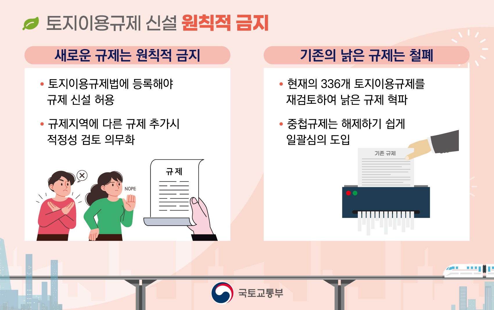 토지이용규제기본법에 등록되지 않은 규제는 앞으로 신규 지정하지 못하도록 하고 , 기존 다른 규제가 존재하는 지역에 새로이 등록된 규제를 추가할 경우에는 적정성 검토를 의무화 합니다.